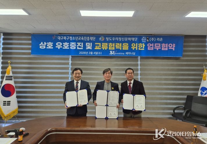 코리아타임뉴스 경북취재본부 | 청도우리정신문화재단(대표이사 기화서)은 지난 3월 4일 화랑정신을 이어가는 청도신화랑풍류마을에서 (재)대구북구청소년교육진흥재단(상임이사 이복우), 한국코미디타운 운영주체 ㈜리온(대표 김미숙)과 상호 우호 증진 및 교류 협력을 위한 업무협약(MOU)을 체결했다.