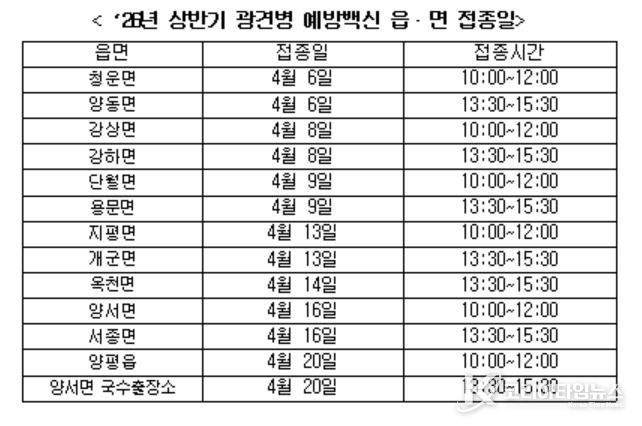 코리아타임뉴스 기동취재팀 | 양평군은 오는 4월 6일부터 4월 24일까지 광견병 예방접종을 실시한다고 밝혔다.