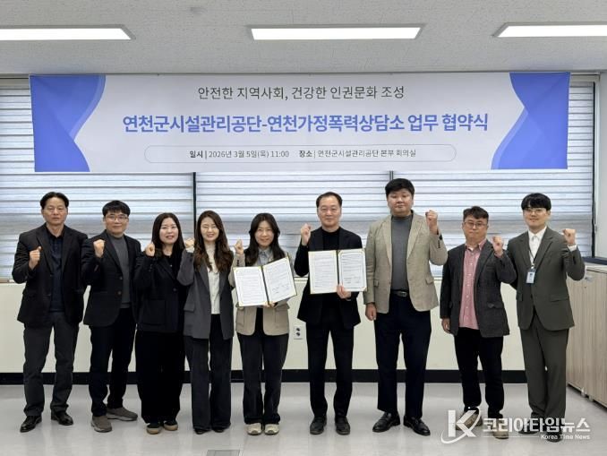코리아타임뉴스 윤광희 기자 | 연천군시설관리공단은 가정폭력과 이로 인해 파생되는 아동학대 등 가정 내 폭력을 예방하고 피해자의 신속한 보호와 일상 회복을 실질적으로 지원하기 위해, 5일 연천가정폭력상담소와 '지역사회 폭력 예방 및 인권 증진을 위한 업무협약'을 체결했다고 밝혔다.