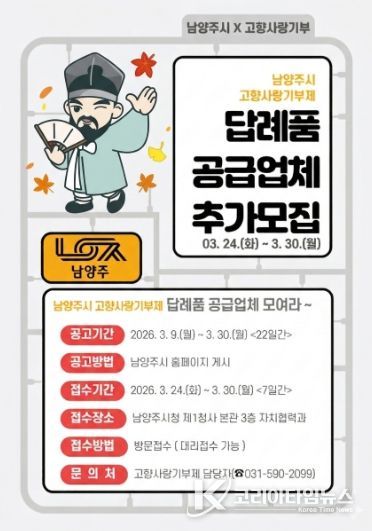 코리아타임뉴스 경기취재본부 | 남양주시는 오는 3월 24일부터 고향사랑기부제 참여자들에게 제공할 ‘2026년 고향사랑기부제 답례품 공급업체’ 추가 모집 접수를 시작한다고 6일 밝혔다.