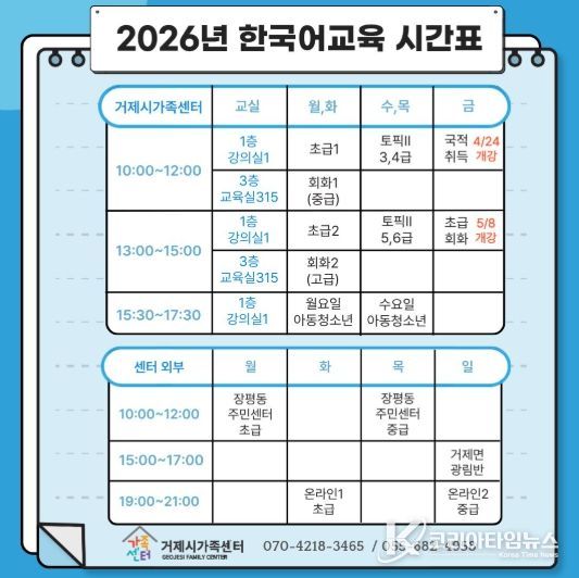 코리아타임뉴스 경남취재본부 | 거제시가족센터는 결혼이민자와 외국인, 중도입국자녀의 한국생활 적응과 안정적인 정착 지원을 위해 5일부터 한국어 교육을 순차적으로 개강한다고 밝혔다.