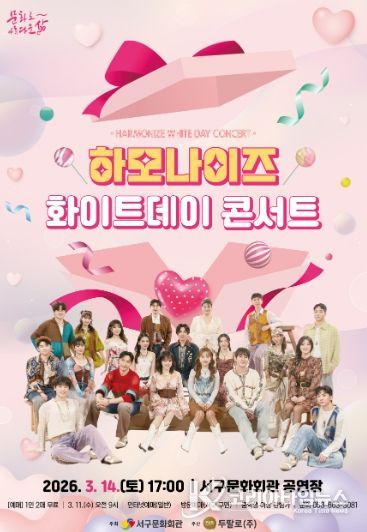 코리아타임뉴스 박찬식 기자 | 서구문화회관은 3월 14일 오후 7시 서구문화회관 공연장에서 목소리로 세상에 희망과 기쁨을 전하는 대한민국 대표 쇼콰이어그룹 하모나이즈를 초청해'화이트데이 콘서트'를 개최한다.
