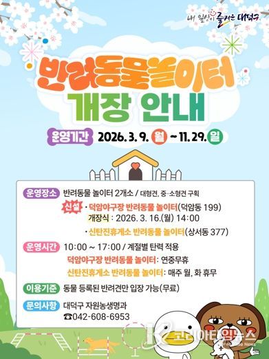 대덕구 관계자는 “반려동물 놀이터 운영을 통해 반려인과 반려동물이 함께 여가를 즐길 수 있는 환경을 조성하고자 한다”며 “앞으로도 반려동물 친화적인 도시 환경 조성과 성숙한 반려문화 확산을 위해 노력하겠다”고 말했다.