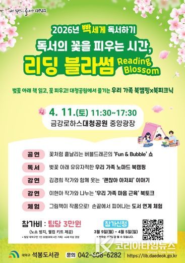 대덕구 관계자는 “벚꽃이 흩날리는 대청공원에서 가족이 나란히 앉아 책을 읽는 경험은 어린이들에게 평생 잊지 못할 소중한 독서의 즐거움을 안겨줄 것으로 기대된다”며 “많은 구민이 참여해 책과 함께 마음의 근육을 키우는 봄날의 이색 체험을 만끽하길 바란다”고 말했다.