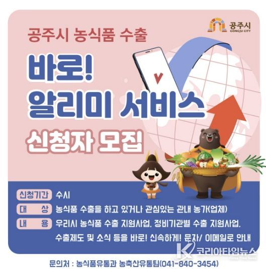 코리아타임뉴스 충남취재본부 | 공주시는 지난해에 이어 농식품 수출과 관련한 다양한 정보를 제공하는 ‘공주시 농식품 수출 바로 알리미’ 서비스에 참여할 농가를 올해도 모집한다고 9일 밝혔다.