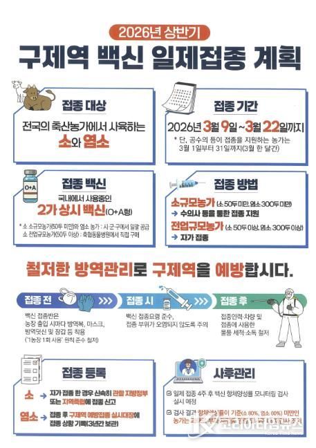 코리아타임뉴스 이아름 기자 | 홍천군은 구제역 유입 방지와 완전 차단을 위해 상반기 구제역 일제 백신접종을 실시한다. 대상은 1,001 농가 36,830두(소 928 농가 33,566두, 염소 73 농가 3,264두) 사육 농가이다.