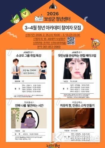 코리아타임뉴스 노승선 기자 | 보성군은 청년들의 역량 강화와 정서적 안정을 지원하기 위해 오는 13일까지 ‘2026년 1차 보성군 청년 아카데미 프로그램’ 참가자를 모집한다고 밝혔다.