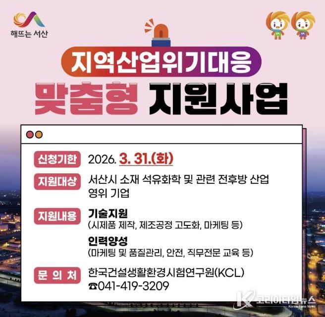코리아타임뉴스 김택호 기자 | 충남 서산시가 석유화학 산업의 위기 극복과 지역경제 활성화를 위해 ‘2026년 지역산업위기 대응 맞춤형 지원사업’을 본격 추진한다고 밝혔다.