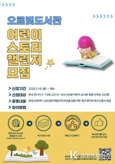 코리아타임뉴스 경기취재본부 | 동두천시 도서문화사업소는 3월 16일부터 관내 5-10세 어린이를 대상으로 ‘어린이 스토리 챌린저’ 참여자를 모집한다고 밝혔다. 이번 사업은 어린이의 자발적인 독서 습관 형성과 ‘책 읽는 동두천’ 분위기 조성 및 독서문화 확산을 위해 마련했다.