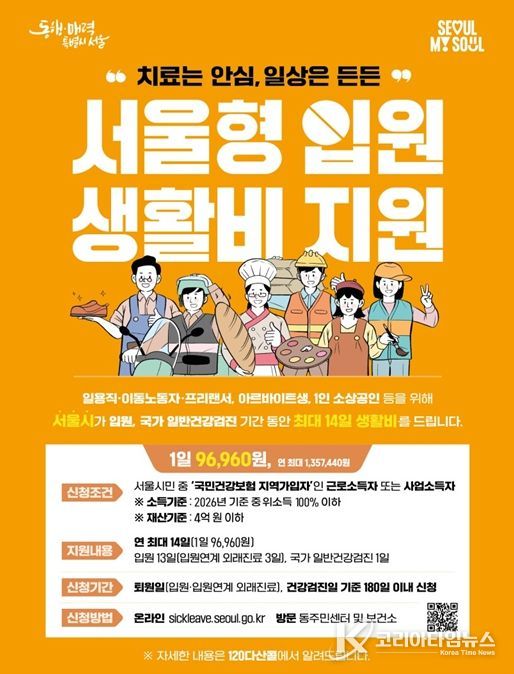 코리아타임뉴스 윤경수 기자 | 서울시는 일하는 시민이 치료를 위한 입원이나 건강검진으로 발생하는 소득 공백을 지원하는 ‘서울형 입원생활비 지원’ 사업의 지원 기준을 완화하고 1일 지원 금액을 96,960원으로 확대한다고 밝혔다.