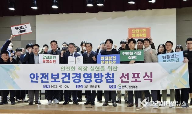 코리아타임뉴스 사회팀 | 군포산업진흥원은 지난 9일 청사 3층 컨벤션홀에서 기관 임직원이 참석한 가운데 '2026년 안전보건경영 선포식'을 개최했다.