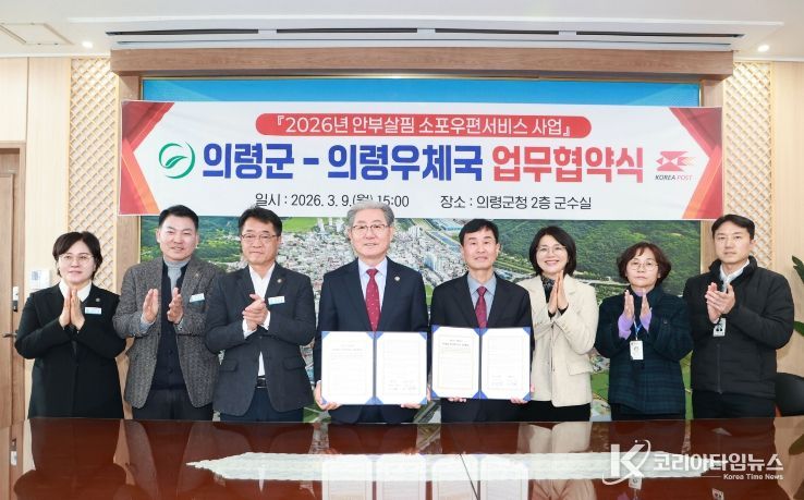 코리아타임뉴스 경남취재본부 | 의령군과 의령우체국(우체국장 반종률)은 지난 9일 고립된 위기가구를 발굴하고 사회적 관계망을 강화하기 위한 ‘안부살핌 소포우편서비스’ 업무협약을 체결했다.
