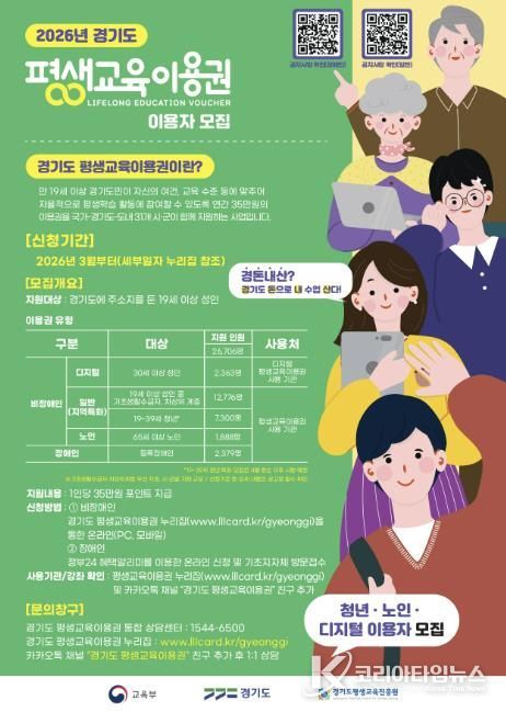 한편, 청년(19세~39세) 평생교육이용권은 4월 중 별도로 모집할 예정이며, 자세한 일정은 추후 안내할 예정이다.