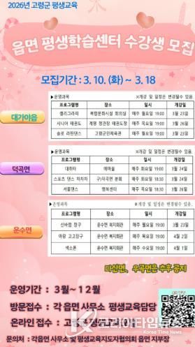 코리아타임뉴스 경북취재본부 | 고령군은 지역 주민들의 근거리 학습권을 보장하고 폭넓은 교육 기회를 제공하기 위해 3월 10일부터 18일까지 ‘2026년 읍·면 평생학습센터’ 수강생을 모집한다고 밝혔다.