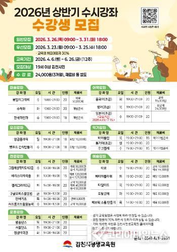 코리아타임뉴스 경북취재본부 | 김천시평생교육원은 2026년 야간강좌 집중 편성과 수요자 맞춤형 교육 강화를 위해 수시강좌를 대폭 확대하여 오는 3월 23일부터 31일까지 수강생을 모집한다.