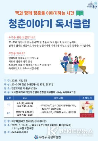 코리아타임뉴스 대전취재본부 | 대전 유성구는 4월과 9월 진잠도서관에서 지역 청년을 대상으로 ‘2026년 청춘이야기 독서클럽’을 운영한다.
