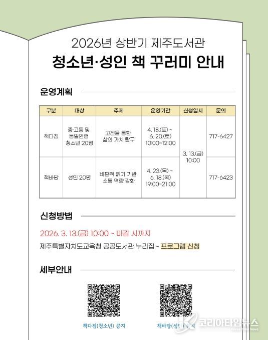 코리아타임뉴스 사회팀 | 제주도교육청 제주도서관은 독서를 통한 사고력 신장과 소통 역량 강화를 지원하기 위해 ‘2026년 상반기 책 꾸러미’를 운영한다.