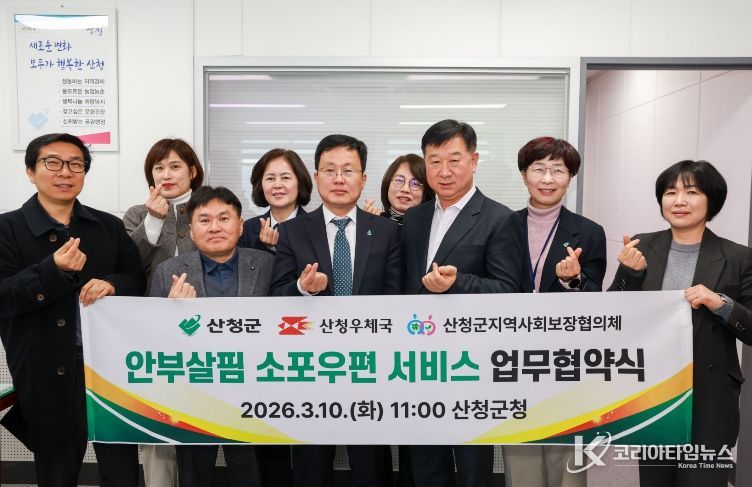 코리아타임뉴스 경남취재본부 | 산청군은 지난 10일 부군수실에서 산청우체국, 산청군지역사회보장협의체와 ‘안부살핌 소포우편 서비스’ 추진을 위한 업무 협약을 체결했다고 밝혔다.