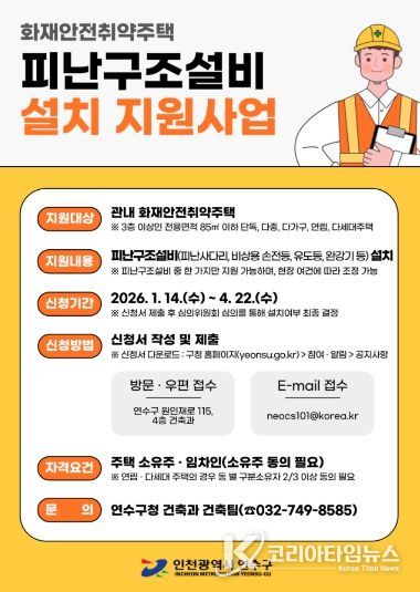 코리아타임뉴스 이아름 기자 | 연수구가 화재 발생 시 대피시설 부족으로 인한 인명 피해를 예방하기 위해 소규모 주택을 대상으로 ‘피난구조설비 설치 지원사업’을 추진한다.