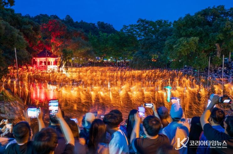하얀 저고리와 바지를 입은 사람들이 뗏목을 타고 연못 위에 낙화봉을 매달아 횃불로 하나씩 점화하는 장면은 행사 준비부터 진행 과정까지 담긴 정성과 전통의 경건함을 느낄 수 있다. 고즈넉한 밤, 약 2시간 동안 연못 위로 쏟아지는 불꽃비와 국악 선율이 어우러져 관람객들에게 잊지 못할 감동을 선사할 예정이다.