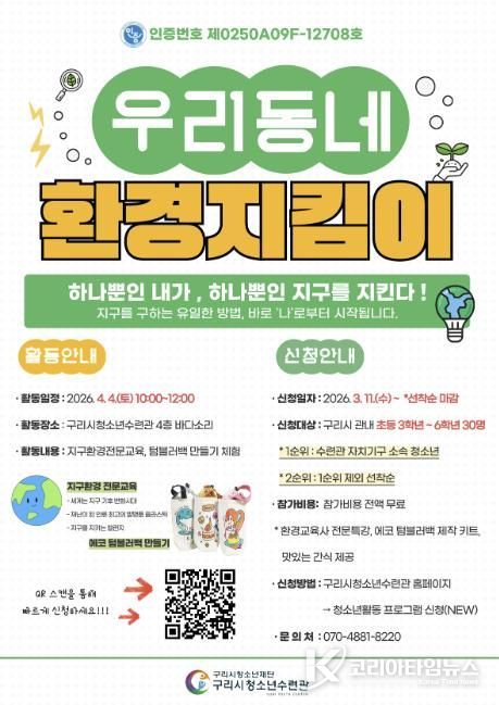 코리아타임뉴스 경기취재본부 | 구리시청소년재단 청소년수련관은 관내 청소년들이 지구 환경의 소중함을 배우고 실천할 수 있는 ‘우리 동네 환경 지킴이’ 프로그램의 참가자를 오는 3월 11일부터 선착순으로 모집한다고 밝혔다.