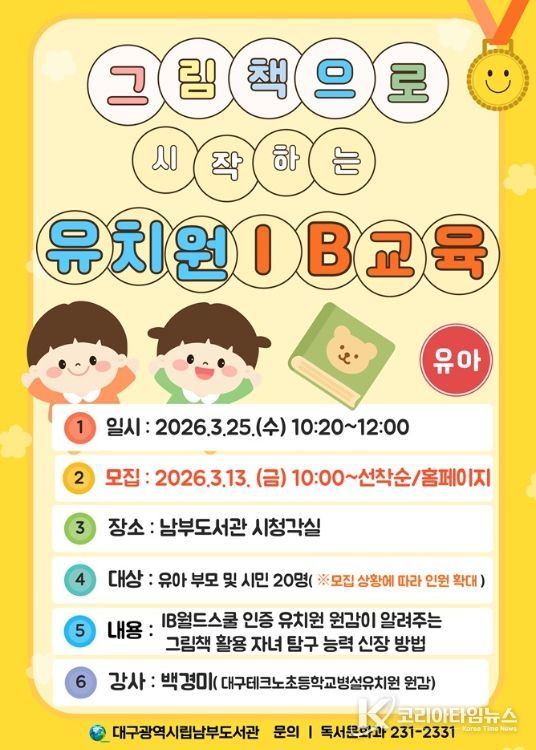 코리아타임뉴스 사회팀 | 대구시교육청 산하 남부도서관은 오는 3월 25일 유치원 학부모의 국제바칼로레아(IB) 교육에 대한 이해를 높이고, 가정에서 그림책을 활용한 탐구 활동을 실천할 수 있도록'그림책으로 시작하는 유치원 국제바칼로레아(IB) 교육' 특강을 운영한다.