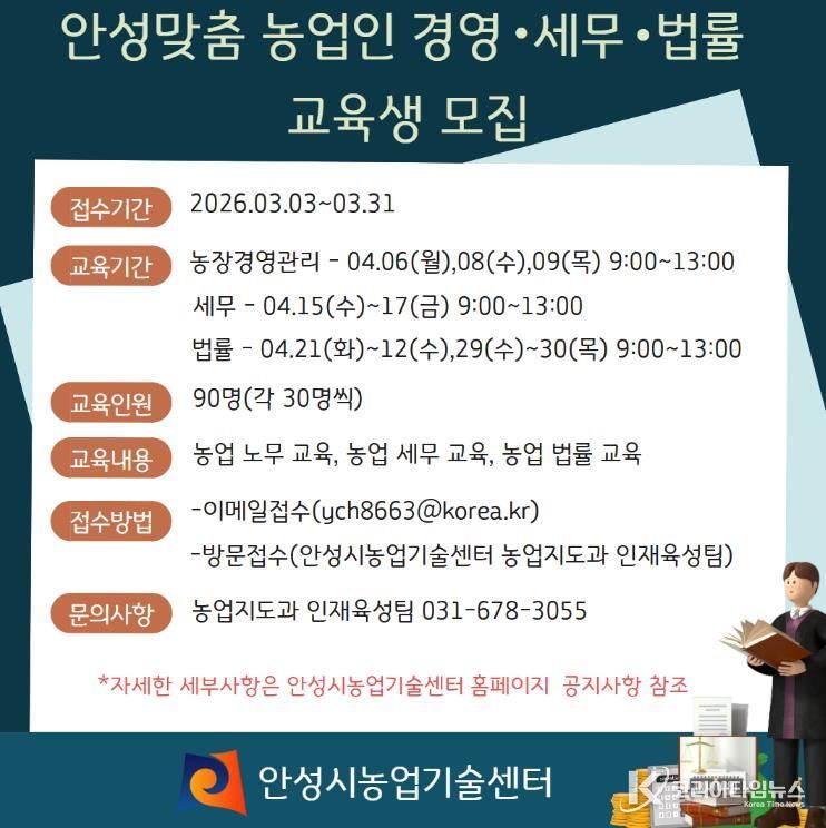 코리아타임뉴스 경기취재본부 | 안성시농업기술센터가 지역 농업인의 안정적인 영농 활동을 돕기 위해 오는 31일까지 ‘안성맞춤 농업인 경영·세무·법률 교육’ 교육생을 모집한다.