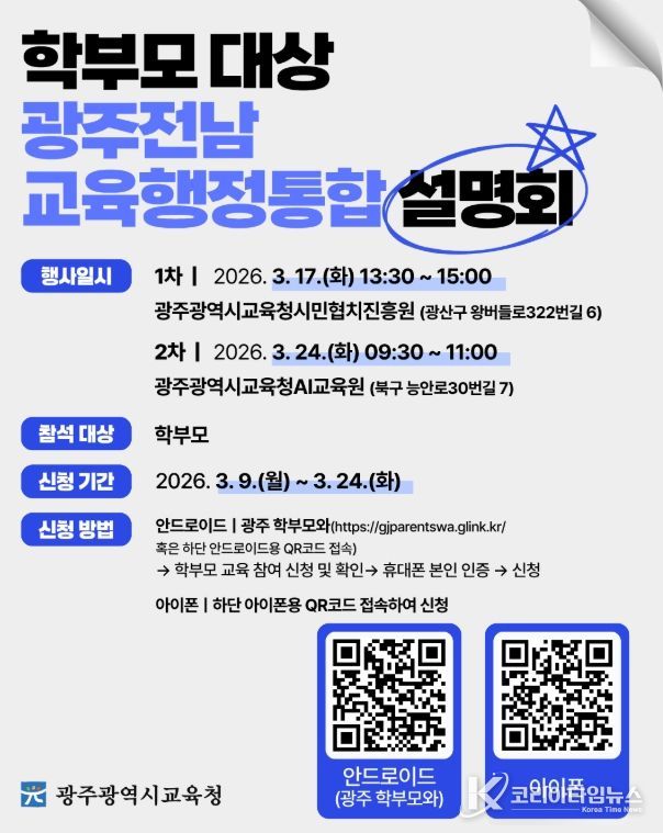 코리아타임뉴스 사회팀 | 광주시교육청이 학부모의 교육행정통합 궁금증을 해소하기 위해 두 차례에 걸쳐 ‘광주·전남 교육행정통합 설명회’를 개최한다.