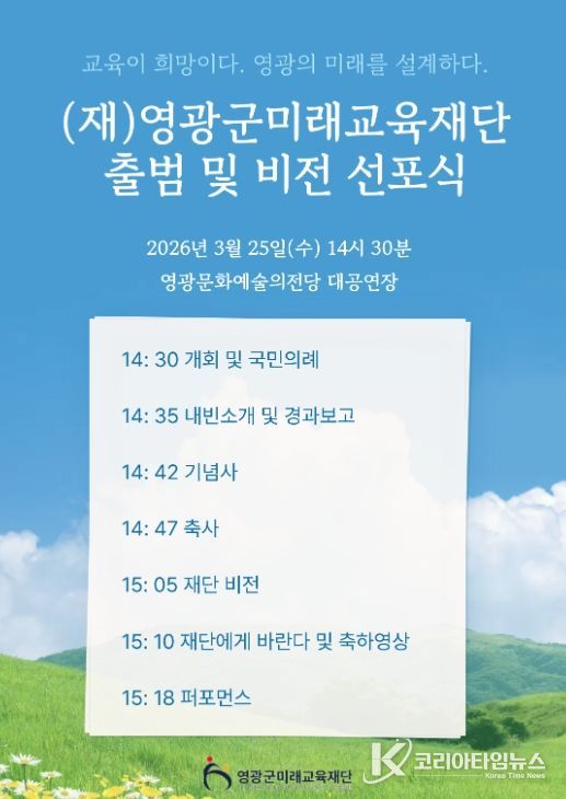 코리아타임뉴스 노승선 기자 | 영광군미래교육재단은 오는 3월 25일 오후 2시 30분, 영광문화예술의전당 대공연장에서 '영광군미래교육재단 출범 및 비전선포식'을 개최한다.