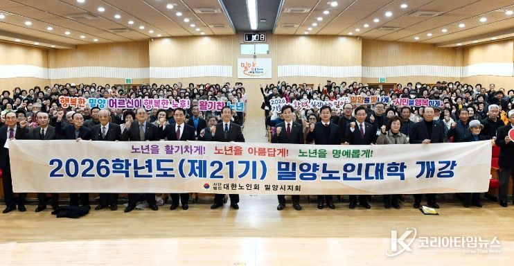 코리아타임뉴스 경남취재본부 | (사)대한노인회 밀양시지회(지회장 신준철)는 11일, 밀양시청 대강당에서 입학생 410명과 내빈들이 참석한 가운데 ‘제21기 밀양노인대학 입학식’을 성황리에 개최했다.
