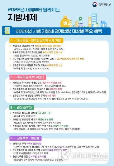 코리아타임뉴스 경남취재본부 | 경남 밀양시는 2026년 인구감소 대응과 지역경제 활성화를 위해 달라진 지방세 관계법령 중, 밀양시 여건과 관련성이 높은 주요 제도를 중심으로 시민과 기업이 체감할 수 있는 핵심 내용을 안내하고 나섰다.