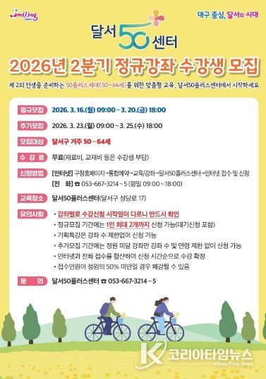코리아타임뉴스 노승선 기자 | 대구 달서구는 50플러스세대의 역량 강화와 자기계발을 지원하기 위해‘2026년 2분기 달서50플러스센터 정규강좌’수강생을 3월 16일부터 25일까지 선착순 모집한다.