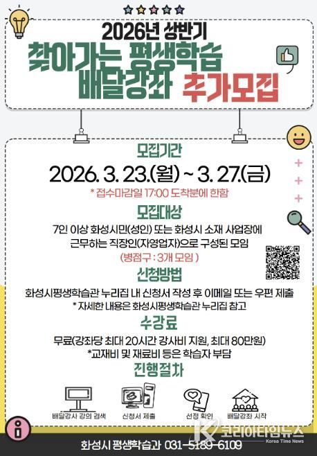 코리아타임뉴스 사회팀 | 화성특례시는 시민의 다양한 학습 수요를 반영한 맞춤형 평생학습 프로그램 운영을 위해 ‘2026년 상반기 찾아가는 평생학습 배달강좌’를 추가 모집한다고 밝혔다.