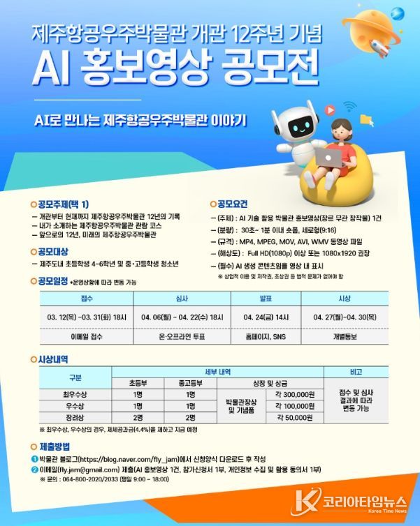 코리아타임뉴스 노승선 기자 | 제주국제자유도시개발센터에서 운영하는 제주항공우주박물관은 개관 12주년을 맞아‘AI 홍보영상 공모전’을 개최한다고 밝혔다.