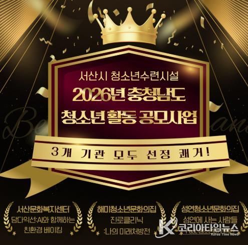 코리아타임뉴스 김택호 기자 | 서산시 청소년수련시설(서산문화복지센터, 해미‧성연청소년문화의집) 3개 기관이 충남사회서비스원 청소년활동진흥센터가 주최한 '2026년 충청남도 청소년 활동 프로그램 공모사업'에 선정됐다고 밝혔다.