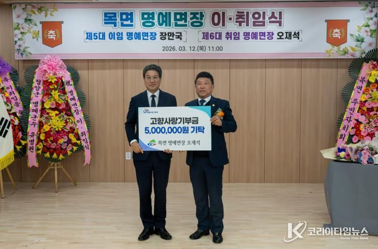 코리아타임뉴스 김택호 기자 | 청양군은 지난 12일 목면 명예면장으로 취임한 오재석 (주)최고무역 대표가 고향사랑기부금 500만 원을 기탁하며 남다른 고향 사랑을 실천했다고 밝혔다.