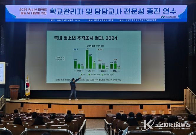 코리아타임뉴스 사회팀 | 제주특별자치도교육청은 12일 제주학생문화원 대강당에서 도내 학교 관리자와 업무 담당 교사 400여 명을 대상으로 ‘2026 청소년 마약류 예방 및 대응 전문성 증진 연수’를 개최했다.