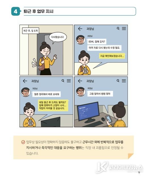 특히 △반복·과도한 지시 △휴가 사용 압박 △업무 편중 △퇴근 후 SNS 업무 지시 △공개적 질책 등 직원들이 실제 업무 환경에서 공감할 수 있는 사례들을 4컷 만화로 풀어내 직원들의 이해도를 높였다.