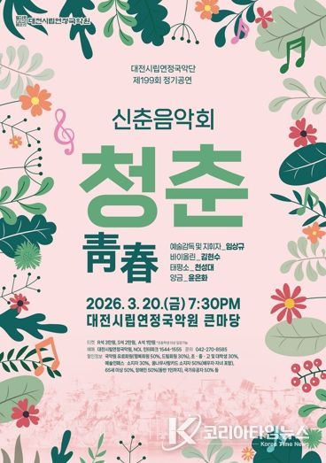 코리아타임뉴스 대전취재본부 | 대전시립연정국악단은 20일 오후 7시 30분, 국악원 큰마당에서 제199회 정기공연 신춘음악회 ‘청춘(靑春)’을 개최한다.