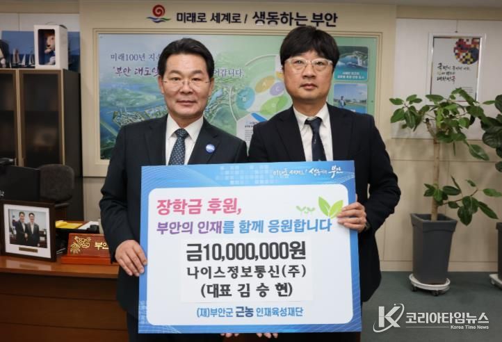 코리아타임뉴스 전북취재본부 | 부안군 근농인재육성재단은 나이스정보통신㈜가 지역 인재 육성과 교육 발전을 위해 근농인재육성장학금 1000만원을 기탁했다고 밝혔다.
