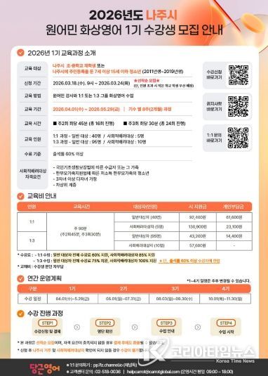 나주시는 오는 3월 18일부터 24일까지 관내 초‧중학생을 대상으로 ‘2026년 나주시 원어민 화상영어 1기’ 수강생 150명을 모집한다고 17일 밝혔다.