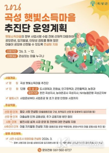 곡성군 관계자는 “햇빛소득마을 추진단을 중심으로 행정과 유관기관이 협력해 마을별 맞춤형 지원체계를 구축해 나가겠다”라며 “사전 컨설팅을 통해 사업 추진 가능성을 꼼꼼히 검토하고 더 많은 마을이 공모사업에 참여할 수 있도록 적극 지원하겠다”라고 말했다.