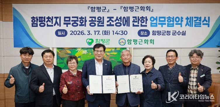 코리아타임뉴스 노승선 기자 | 전남 함평군이 나라꽃 무궁화의 저변 확대와 함평천지 무궁화 공원 조성을 위해 함평근화회(회장 정천수)와 업무협약을 체결했다.