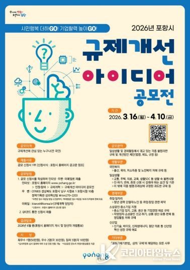 코리아타임뉴스 경북취재본부 | 포항시는 일상생활과 경제활동에 불편을 주는 불합리한 규제를 시민과 함께 발굴하고 개선하기 위해 3월 16일부터 4월 10일까지 ‘2026년 포항시 규제개선 아이디어 공모전’을 개최한다.
