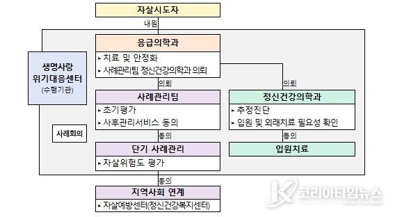 사업 참여 병원에서는 응급치료와 함께 정신건강의학과 진료 의뢰, 초기상담 및 위험도 평가를 실시하고, 병원에서 단기 사례관리(4회)를 거쳐 자살예방센터·정신건강복지센터 등 지역사회 자원으로 연계한다.