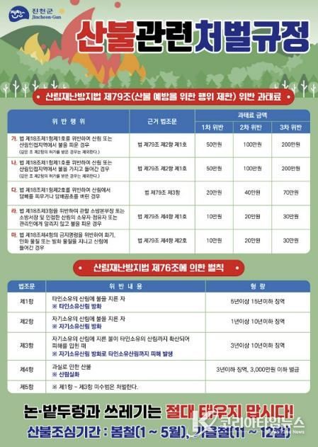 코리아타임뉴스 충북취재본부 | 충북 진천군은 봄철 산불조심 기간을 맞아 불법 소각 등 산불 발생 원인을 제공하는 행위에 대해 ‘무관용 원칙’으로 강력한 단속을 실시하고 있다고 18일 밝혔다.