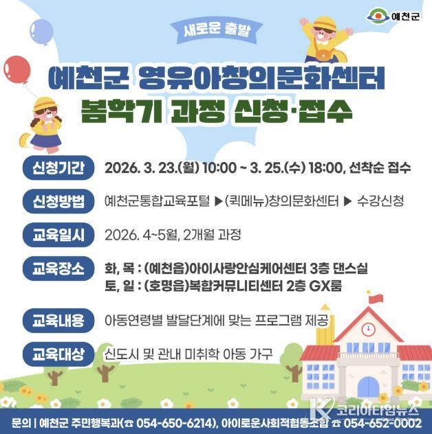 코리아타임뉴스 경북취재본부 | 예천군은 관내 영유아의 건강한 성장과 창의력 발달을 지원하기 위해 예천군 영유아 창의문화센터 봄학기 프로그램 수강생을 모집한다.