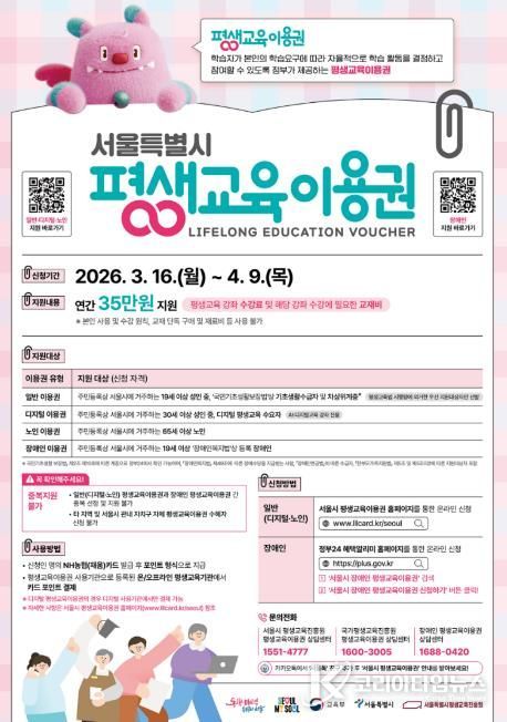 코리아타임뉴스 사회팀 | 서울 도봉구가 2026년 평생교육이용권 신청자를 4월 9일까지 접수한다.