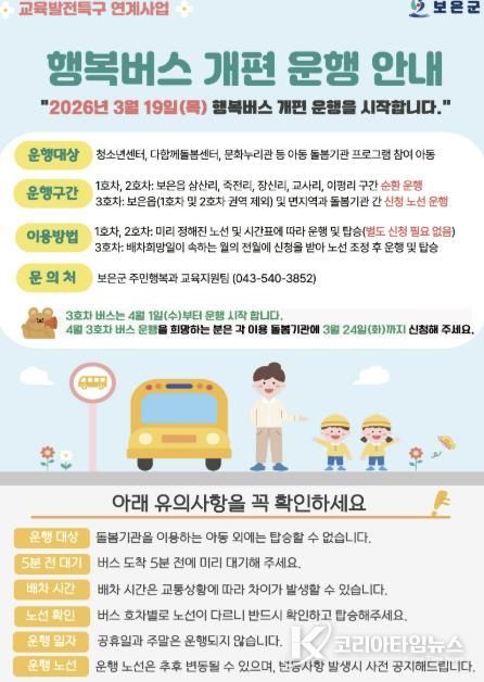 코리아타임뉴스 충북취재본부 | 충북 보은군은 교육발전특구사업의 일환으로 2025년 7월부터 운영 중인 ‘행복버스’를 오는 19일부터 개편 운행한다고 밝혔다.