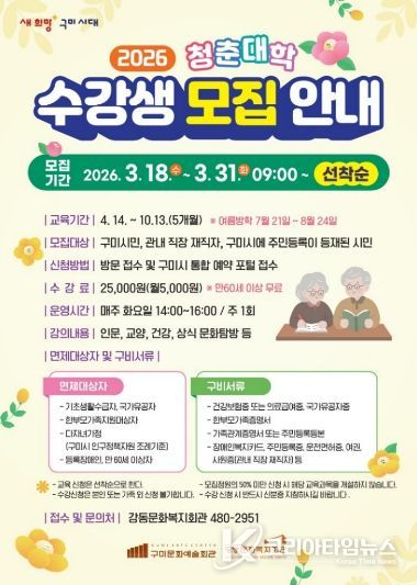 코리아타임뉴스 노승선 기자 | 구미시강동문화복지회관은 3월 18일부터 3월 31일까지 ‘청춘대학’ 수강생을 모집한다.
